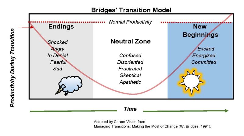 When something ends or changes, like a reorganization or the departure of team members, it best to see it as an external reality, something everyone agrees happened. A transition, on the other hand, is what occurs in the minds of individuals, groups, and teams as they grapple with loss and the lack of clarity around what comes next....